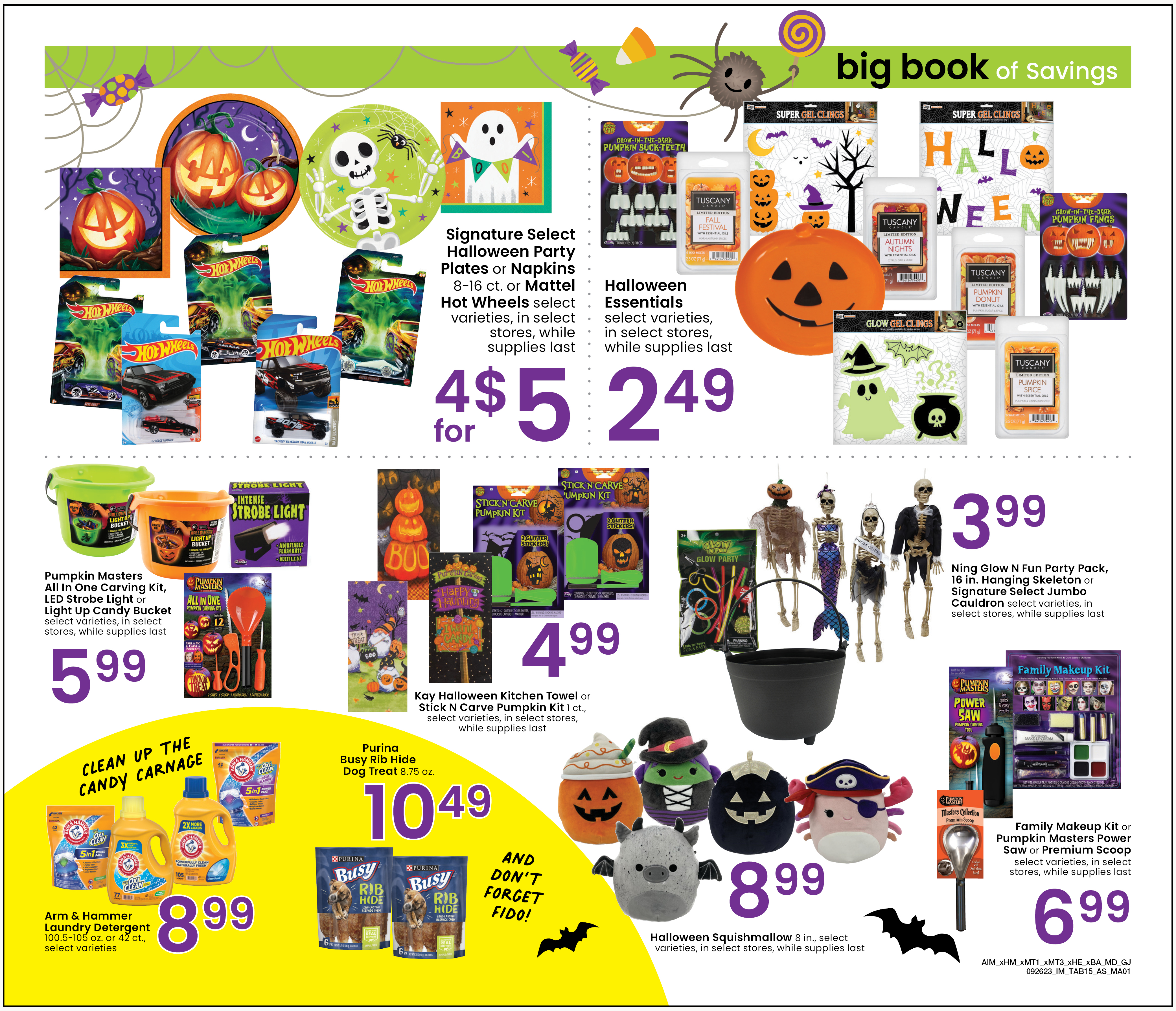 As you can see in the far left image, sometimes not all spaces (mods) on the page have been assigned items yet by the first round of proofing and revisions. Once all items have been assigned, it's time to get creative! In this particular instance, I altered the layout so that only the top portion maintained a grid setup, then arranged the other mods to be more, as I like to say, "floaty" to make reading the page more dynamic. I added a large yellow "rising moon" behind the laundry and pet products as well as copy in a handwritten-style font to tie them into the Halloween theme of the page.