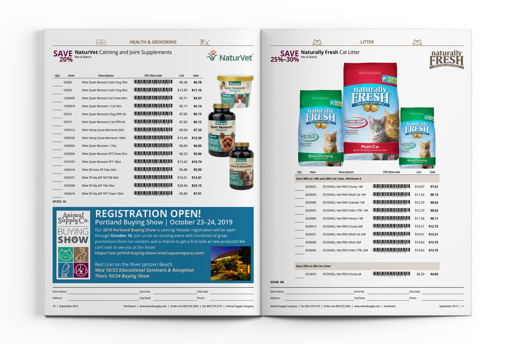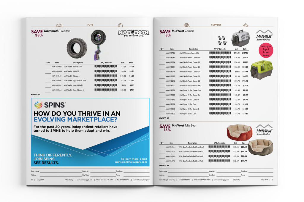 Animal Supply Co. partnered with SPINS, a data and analytics company, with the goal of helping retailers, especially small and independently owned ones, understand the broader world of business and industry trends better so that they can grow and thrive in the competitive pet market. This was a case where I was provided assets and a style guide by a third party (SPINS) to create ads for them within the Retail Messenger, such as this September 2019 Northwest Edition, that communicate the benefits of using their service to the retailer in an engaging and easy to understand way. Between the info-graphic and the colorful paws at the bottom, I made the ad relevant to the pet industry and a bit more fun.