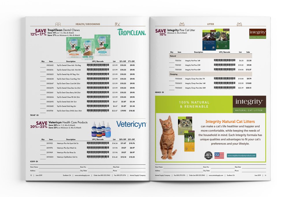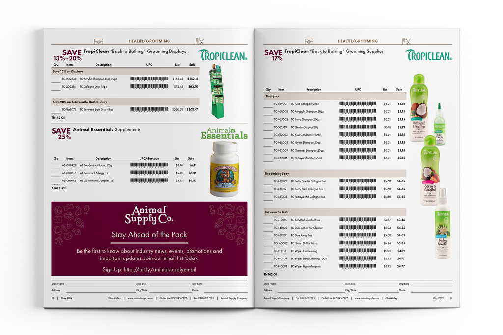 Around the same time as the e-ordering improvements, Animal Supply Co. also rebuilt the website from the ground up to be bigger and better than before. I then created this ad, as you can see here in the Retail Messenger April 2019 Ohio Valley Edition (and it was used in other editions too), to call out the new features retailers can find and use when they visit the Animal Supply Co. website, and how it can help them be even more efficient than before with building and placing orders.