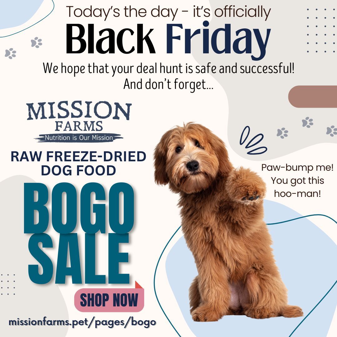 Wakey, wakey! It's Black Friday and there's deals to be scored - especially this one from Mission Farms, who wishes safe shopping. A furry friend confidently assures the viewer that today will be a great day.
